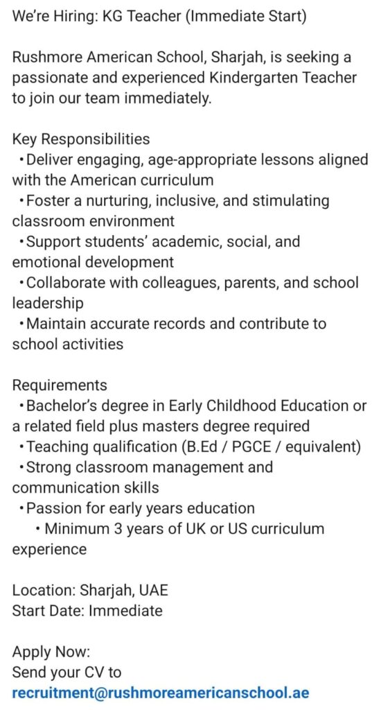 UAE Jobs Hiring KG Teacher (Immediate start) Last updated: 2026/01/08 at 7:21 PM vishwalokam.com@gmail.com Share 0 Min Read SHARE You Might Also Like Hiring Arabic Teacher Hiring English Teacher Hiring Art Teacher-Female Hiring Teachers Hiring Teachers- Al Ain Sign Up For Daily NewsletterBe keep up! Get the latest breaking news delivered straight to your inbox. Please leave this field empty You’ve been successfully subscribed to our newsletter! By signing up, you agree to our Terms of Use and acknowledge the data practices in our Privacy Policy. You may unsubscribe at any time. vishwalokam.com@gmail.com January 8, 2026 January 8, 2026 Share This Article Facebook Twitter Copy Link Print Previous News Hiring Teachers-Sharjah Next News Hiring Homeroom Teacher Leave a comment Leave a comment Leave a Reply Cancel replyYour email address will not be published. Required fields are marked *Comment * Name * Email * Website Save my name, email, and website in this browser for the next time I comment. Yes, add me to your mailing list Stay Connected Facebook Like Instagram Follow Youtube Subscribe Latest News പോരാട്ടത്തിനൊരുങ്ങി കോണ്ഗ്രസ്, നിയമസഭ പ്രചരണ കമ്മിറ്റി ചെയര്മാന് രമേശ് ചെന്നിത്തല, പ്രകടന പത്രിക ചെയര്മാന് ബെന്നി ബഹനാന് India Kerala February 12, 2026 ഡല്ഹി സര്വ്വകലാശാലയില് ആക്രമണ ശ്രമം, ചരിത്രകാരന് ഇര്ഫാന് ഹബീബിന് നേരെ വെള്ളം നിറച്ച ബക്കറ്റെറിഞ്ഞു (വീഡിയോ) Education India February 12, 2026 കാനഡയെ കണ്ണീരിലാഴ്ത്തിയ സ്കൂള് വെടിവെയ്പ്പ്, അക്രമി ട്രാന്സ്ജെന്ഡര്, അന്വേഷണം ആരംഭിച്ച് പോലീസ് India Internaltional February 12, 2026 ചരിത്ര സംഗമത്തിന് മണിക്കൂറുകള് മാത്രം ബാക്കി, നിർദ്ദേശവുമായി പോലീസ് മേധാവി, സമസ്ത ശതാബ്ദി സമാപനം റെക്കോര്ഡ് ബുക്കില് ഇടം നേടിയേക്കും India Internaltional Kerala February 8, 2026