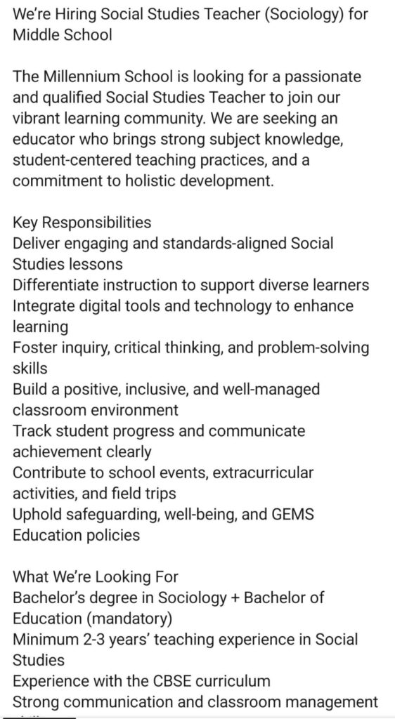 Vishwalokam > Blog > UAE Jobs > Hiring Social Studies Teacher