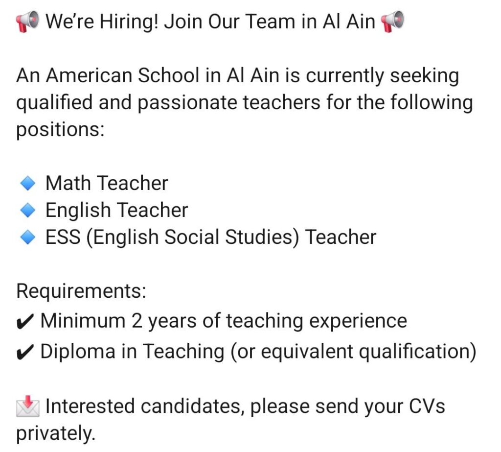 UAE Jobs Hiring Teachers- Al Ain Last updated: 2026/02/01 at 7:15 PM vishwalokam.com@gmail.com Share 0 Min Read SHARE You Might Also Like Hiring Arabic Teacher Hiring English Teacher Hiring Art Teacher-Female Hiring Teachers Hiring History teacher Sign Up For Daily NewsletterBe keep up! Get the latest breaking news delivered straight to your inbox. Please leave this field empty You’ve been successfully subscribed to our newsletter! By signing up, you agree to our Terms of Use and acknowledge the data practices in our Privacy Policy. You may unsubscribe at any time. vishwalokam.com@gmail.com February 1, 2026 February 1, 2026 Share This Article Facebook Twitter Copy Link Print Previous News Hiring History teacher Next News Hiring Teachers Leave a comment Leave a comment Leave a Reply Cancel replyYour email address will not be published. Required fields are marked *Comment * Name * Email * Website Save my name, email, and website in this browser for the next time I comment. Yes, add me to your mailing list Stay Connected Facebook Like Instagram Follow Youtube Subscribe Latest News ബംഗളുരുവില് കാര് നിയന്ത്രണം വിട്ടു, വിദ്യാര്ത്ഥികളടക്കം ഏഴ് പേര്ക്ക് ദാരുണാന്ത്യം India Kerala February 13, 2026 പോരാട്ടത്തിനൊരുങ്ങി കോണ്ഗ്രസ്, നിയമസഭ പ്രചരണ കമ്മിറ്റി ചെയര്മാന് രമേശ് ചെന്നിത്തല, പ്രകടന പത്രിക ചെയര്മാന് ബെന്നി ബഹനാന് India Kerala February 12, 2026 ഡല്ഹി സര്വ്വകലാശാലയില് ആക്രമണ ശ്രമം, ചരിത്രകാരന് ഇര്ഫാന് ഹബീബിന് നേരെ വെള്ളം നിറച്ച ബക്കറ്റെറിഞ്ഞു (വീഡിയോ) Education India February 12, 2026 കാനഡയെ കണ്ണീരിലാഴ്ത്തിയ സ്കൂള് വെടിവെയ്പ്പ്, അക്രമി ട്രാന്സ്ജെന്ഡര്, അന്വേഷണം ആരംഭിച്ച് പോലീസ് India Internaltional February 12, 2026