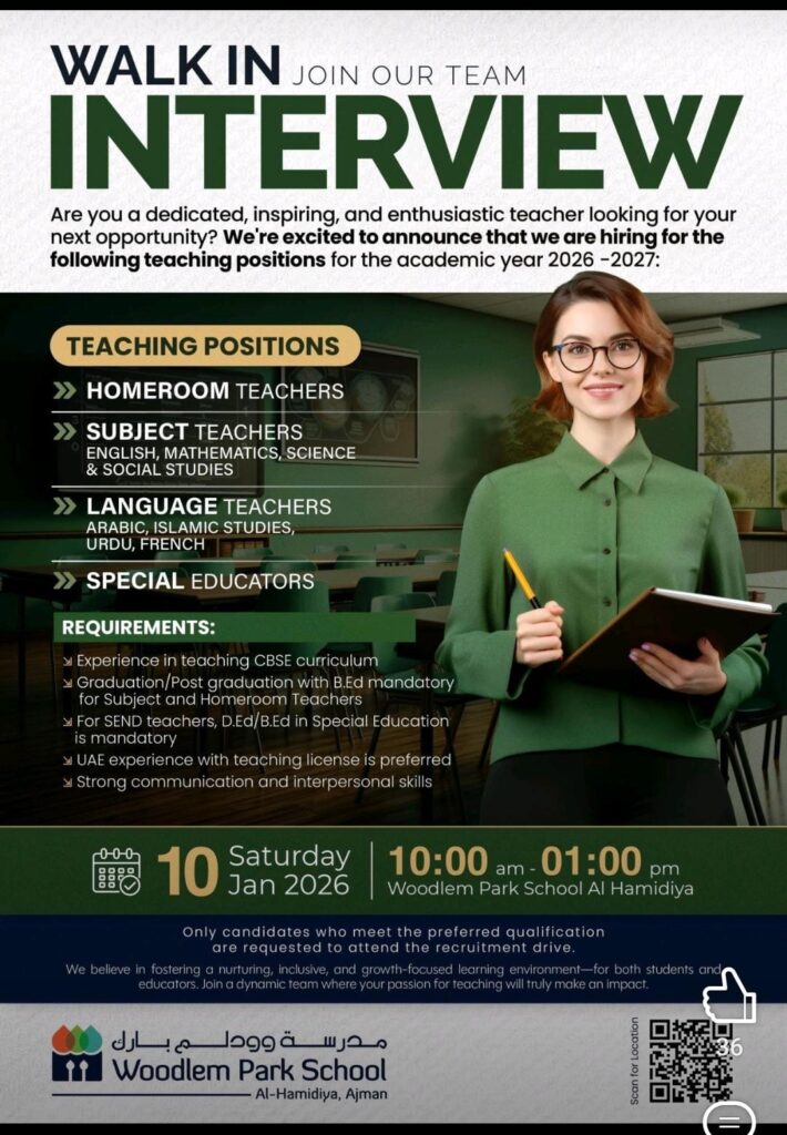 UAE Jobs Walk in Interview- Woodlempark school Last updated: 2026/01/02 at 10:06 AM vishwalokam.com@gmail.com Share 0 Min Read SHARE You Might Also Like Hiring Arabic Teacher Hiring English Teacher Hiring Art Teacher-Female Hiring Teachers Hiring Teachers- Al Ain Sign Up For Daily NewsletterBe keep up! Get the latest breaking news delivered straight to your inbox. Please leave this field empty You’ve been successfully subscribed to our newsletter! By signing up, you agree to our Terms of Use and acknowledge the data practices in our Privacy Policy. You may unsubscribe at any time. vishwalokam.com@gmail.com January 2, 2026 January 2, 2026 Share This Article Facebook Twitter Copy Link Print Previous News ചരിത്രം പിറന്നു; ഖുര്ആന് തൊട്ട് സത്യപ്രതിജ്ഞ, ന്യൂയോര്ക്ക് മേയറായി സൊഹ്റാന് മംദാനി അധികാരമേറ്റു Next News Hiring teachers-Baniyas west, Abu Dhabi Leave a comment Leave a comment Leave a Reply Cancel replyYour email address will not be published. Required fields are marked *Comment * Name * Email * Website Save my name, email, and website in this browser for the next time I comment. Yes, add me to your mailing list Stay Connected Facebook Like Instagram Follow Youtube Subscribe Latest News പോരാട്ടത്തിനൊരുങ്ങി കോണ്ഗ്രസ്, നിയമസഭ പ്രചരണ കമ്മിറ്റി ചെയര്മാന് രമേശ് ചെന്നിത്തല, പ്രകടന പത്രിക ചെയര്മാന് ബെന്നി ബഹനാന് India Kerala February 12, 2026 ഡല്ഹി സര്വ്വകലാശാലയില് ആക്രമണ ശ്രമം, ചരിത്രകാരന് ഇര്ഫാന് ഹബീബിന് നേരെ വെള്ളം നിറച്ച ബക്കറ്റെറിഞ്ഞു (വീഡിയോ) Education India February 12, 2026 കാനഡയെ കണ്ണീരിലാഴ്ത്തിയ സ്കൂള് വെടിവെയ്പ്പ്, അക്രമി ട്രാന്സ്ജെന്ഡര്, അന്വേഷണം ആരംഭിച്ച് പോലീസ് India Internaltional February 12, 2026 ചരിത്ര സംഗമത്തിന് മണിക്കൂറുകള് മാത്രം ബാക്കി, നിർദ്ദേശവുമായി പോലീസ് മേധാവി, സമസ്ത ശതാബ്ദി സമാപനം റെക്കോര്ഡ് ബുക്കില് ഇടം നേടിയേക്കും India Internaltional Kerala February 8, 2026